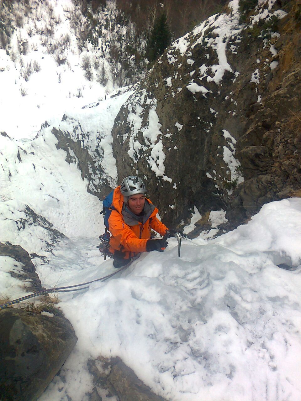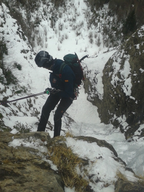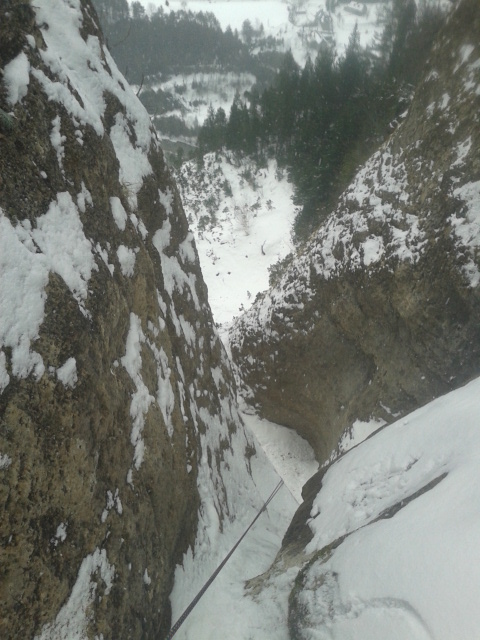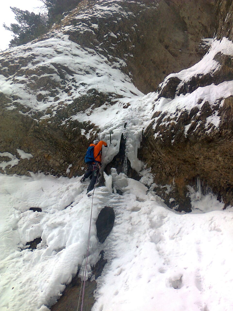 Foto superior derecha, ultimo largo, nosotros salimos por la izquierda, buscando el mejor hielo, tras superar unos 20 m. de hielo "delicadillo" se llega a una zona de roca en la que encontramos un "cordino salvador" y realizamos una travesia a derecha para llegar a la ultima reunion, un clavo y un cordino en un tronco, desde donde se inicia el descenso de la via.