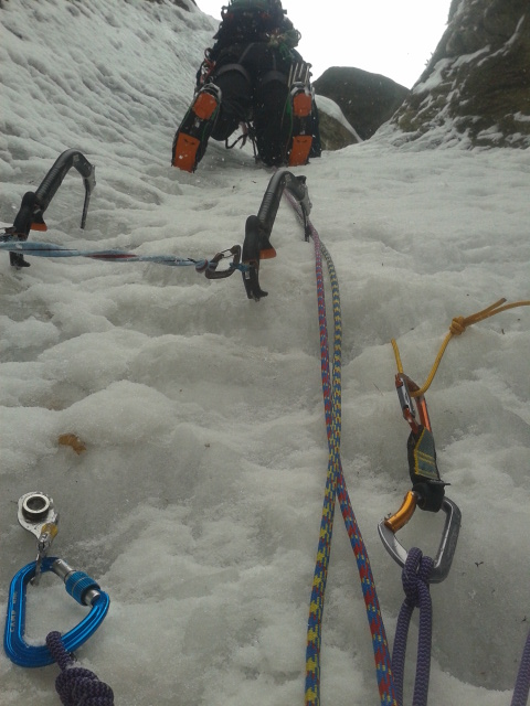 Segundo largo, 35m. a 80º, reunion a la derecha. Foto de la derecha, llegada a la reunion del segundo de cordada.
